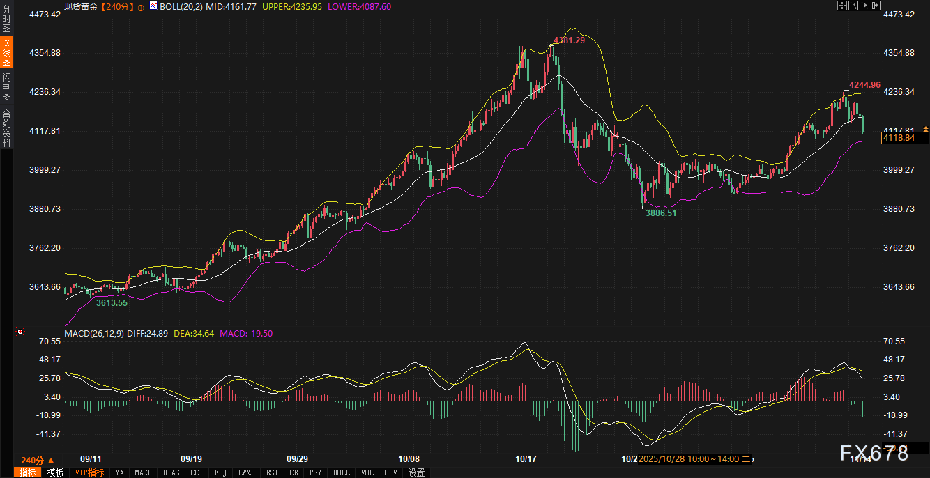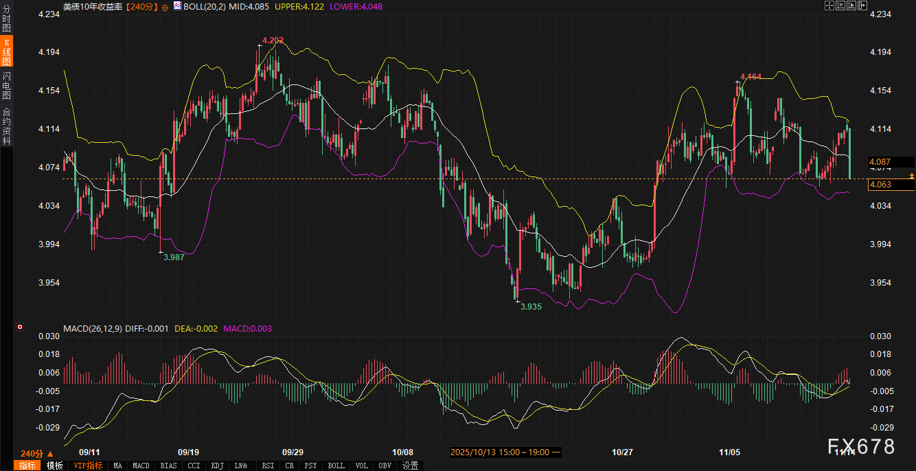 全球避险需求也支撑美债。地缘政治紧张与经济放缓担忧推动资金流入。芝加哥市宣布停止约100亿美元美债投资,但规模微小,未构成系统性影响。技术面看,10年期收益率跌破布林带中轨,MACD指标为负,下行动能仍存。支撑区间在4.00%-4.05%,阻力区间在4.12%-4.15%。