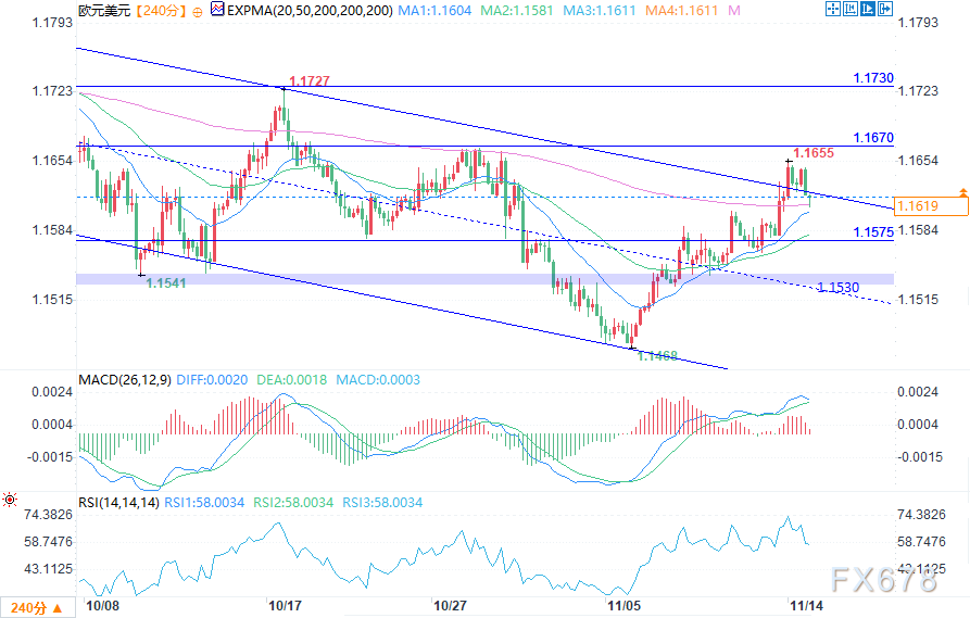 汇通财经APP讯——周五(11月14日)欧盘时段,欧元/美元在连续七个交易日上涨后缩减涨幅,发稿时交投于1.1615,本周仍有望上涨0.45%。