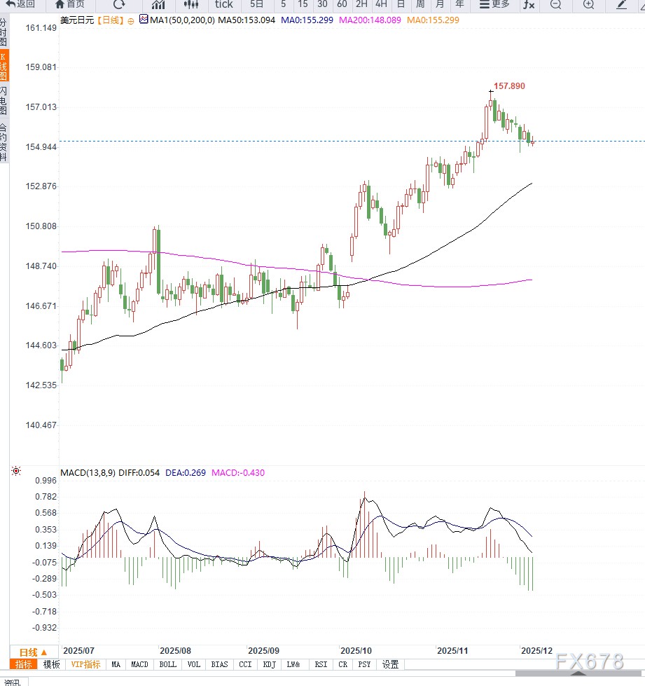 美元兑日元周三下挫的起因来自未能有效站上 100小时均线 与156.00整位关口。从技术结构看,若价格跌破 155.00 心理关口,空头将完全掌控局面,并推动汇价进一步回调至前高 158.00 附近形成的下降通道目标位。