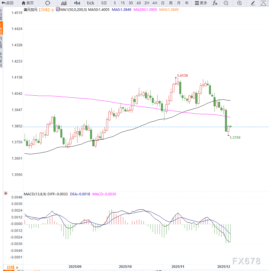 汇通财经APP讯——美元兑加元在周二亚洲交易时段表现偏弱,未能延续前一日自1.3800低点的反弹动能。当前汇价维持在1.3850区间内震荡,显示市场在关键央行决议前进入谨慎模式。