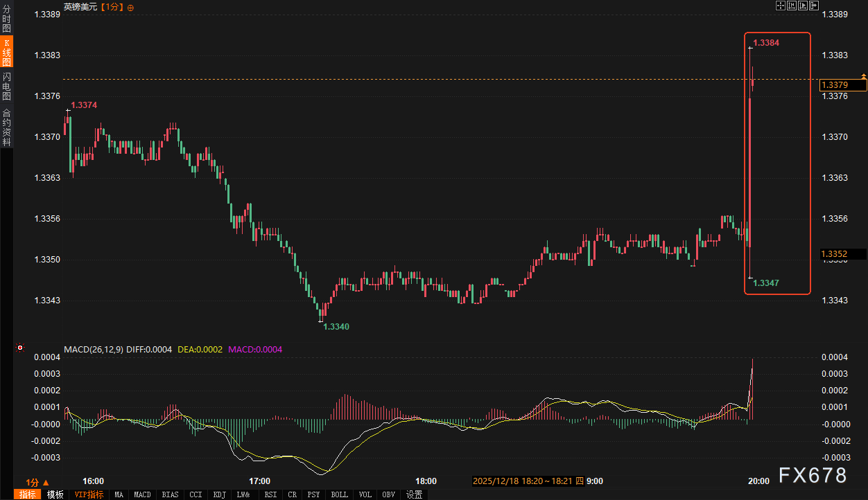 外汇市场方面,英镑兑美元汇率上演了典型的“买预期,卖事实”行情。决议公布前,市场已普遍计价了此次降息,英镑兑美元交投于1.3355附近。决议公布瞬间,英镑快速拉升约47点,最高触及1.3394。这一急升反映出,5-4的投票结果比部分市场参与者预期的更为胶着,且政策声明中关于“判断将变得更加微妙”的表述被解读为偏向鹰派。然而,涨势未能持久,英镑随后小幅回落。这表明市场在初步消化决议细节后,意识到通胀风险并未完全消除,且未来降息步伐可能非常渐进,限制了英镑的深层下跌动能。截至发稿,英镑兑美元回落至1.3370-1.3380区间整固。