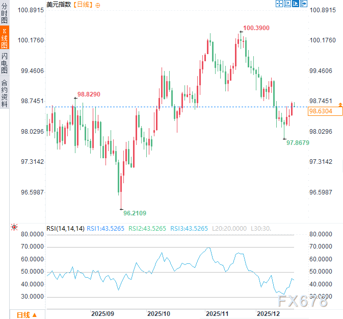 美元2026年走势将是“美联储政策路径”与“其他主要央行政策路径”之间相对优势的较量。美国经济因AI可能更具韧性,通胀更具粘性,这为美联储提供了比其他央行(如已开始降息的欧洲央行)更晚、更慢宽松的余地。这一相对优势,是当前环境下支撑美元的最主要逻辑。然而,政治干预风险和内部政策分歧是这一逻辑面临的最大威胁。周一亚市时段,美元指数于98.65附近窄幅震荡。